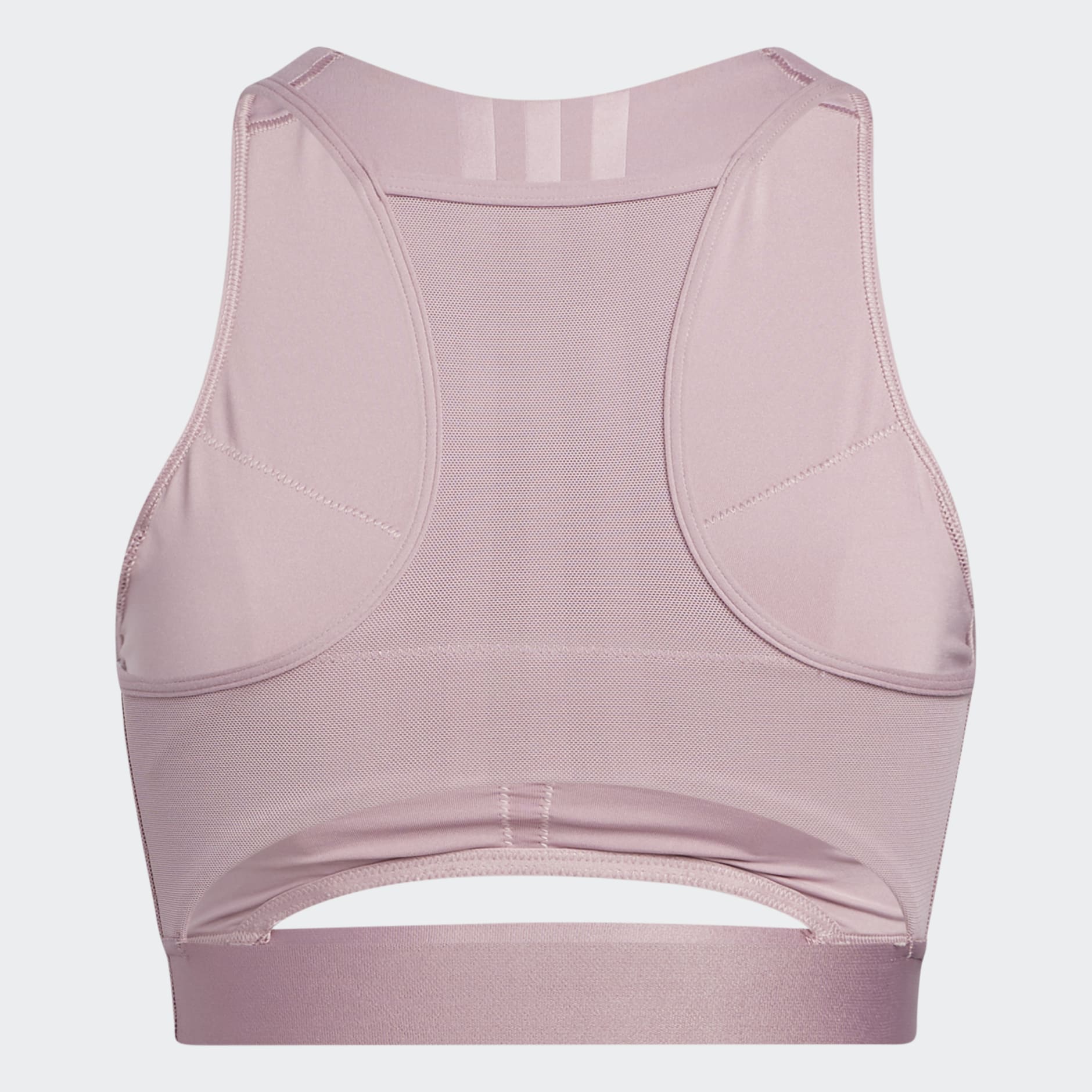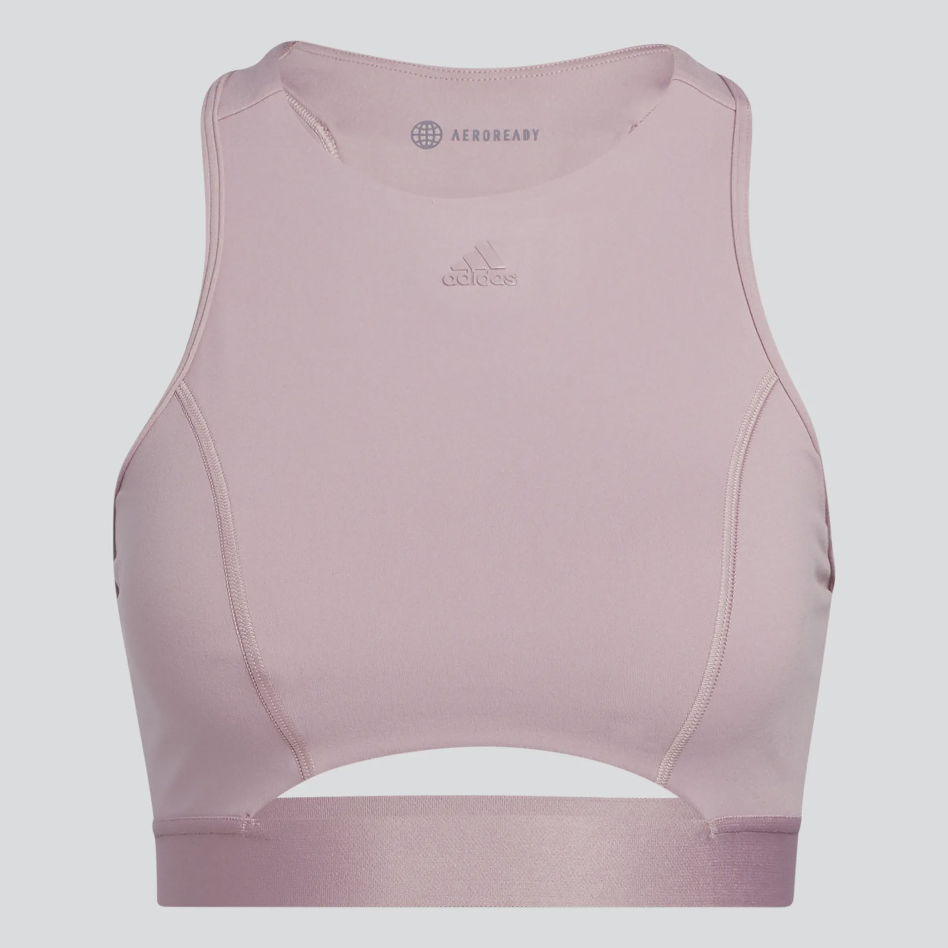 Grace and strength are built one barre or yoga session at a time. This adidas AEROREADY workout bra provides medium support for studio classes. The high-neck design provides a stay-put fit for inversions and balance poses. Peached fabric is soft and smooth. Removable pads let you choose your level of coverage.