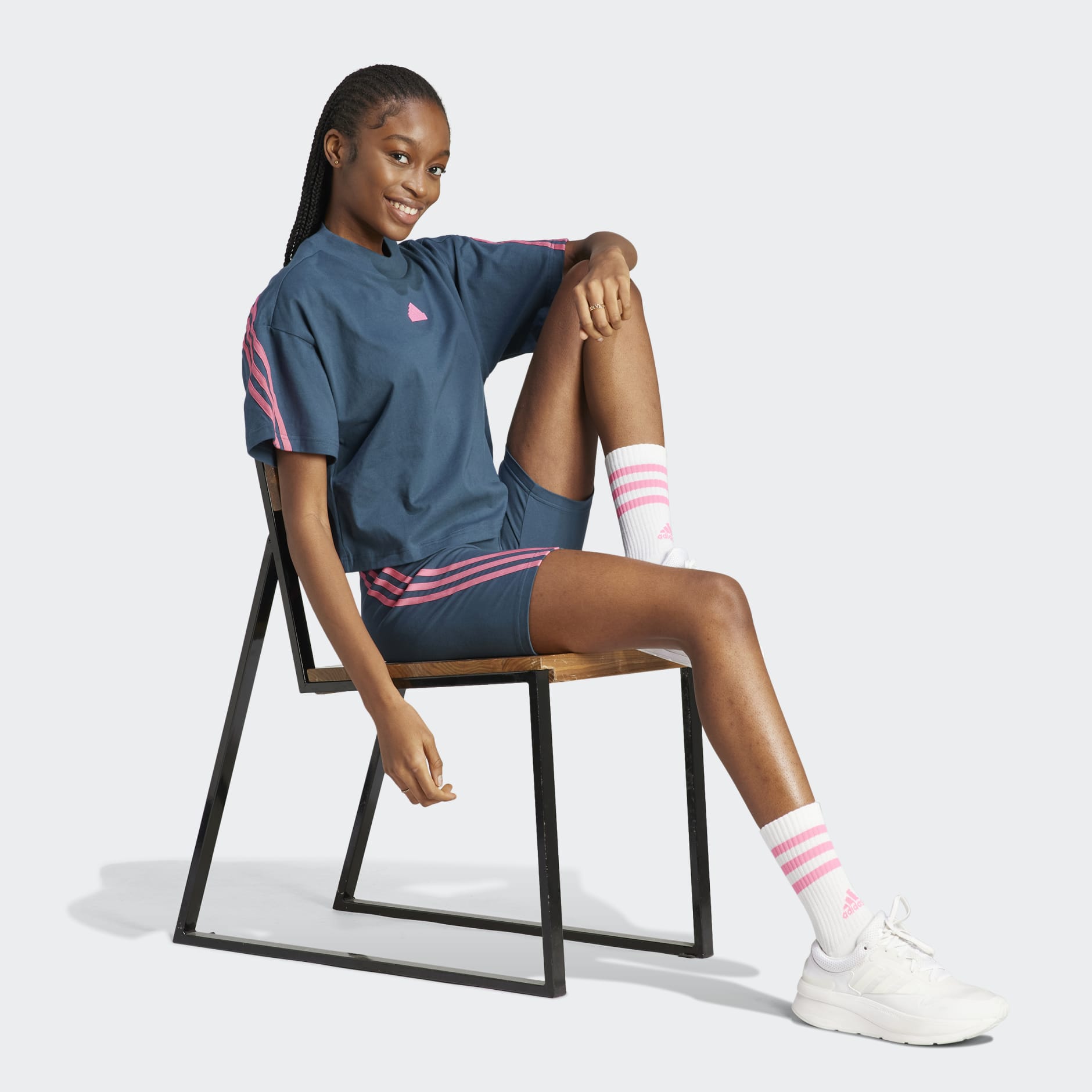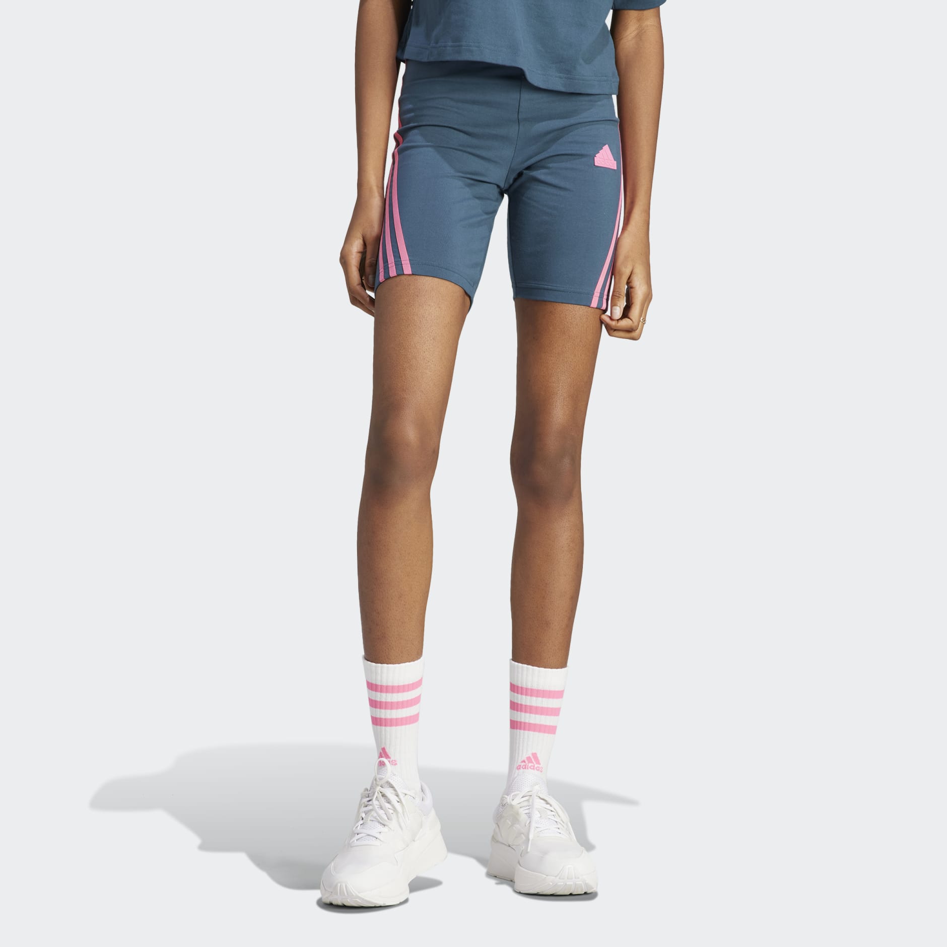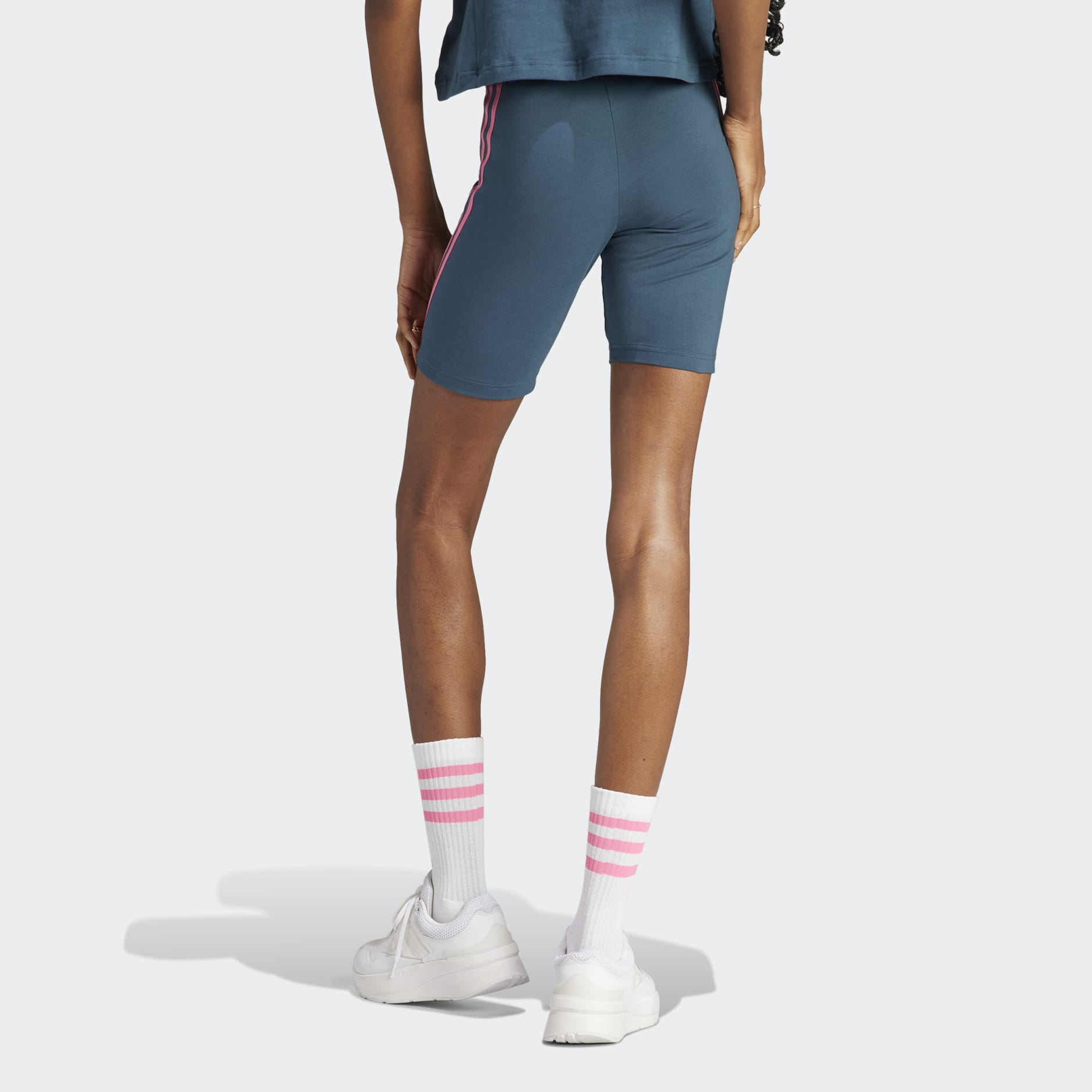 Feel at ease in these comfy adidas bike shorts. The soft, stretchy cotton fabric makes them ideal for everyday wear. The high-rise waist stays put and sits flat against your core, while 3-Stripes wrap both sides for a sporty look. Our cotton products support more sustainable cotton farming.