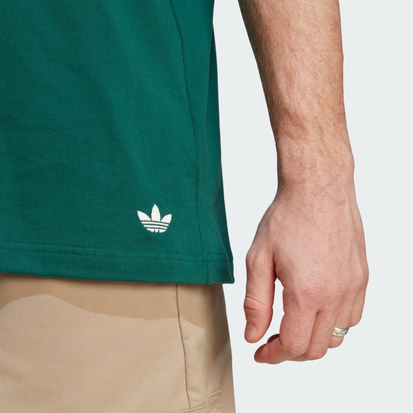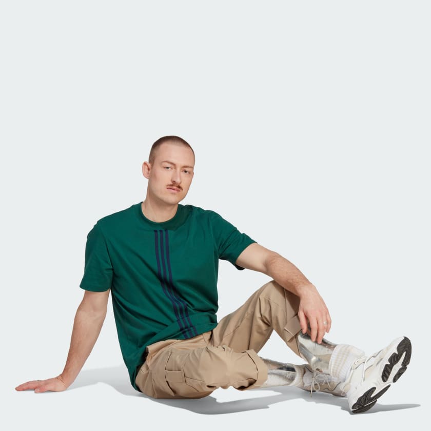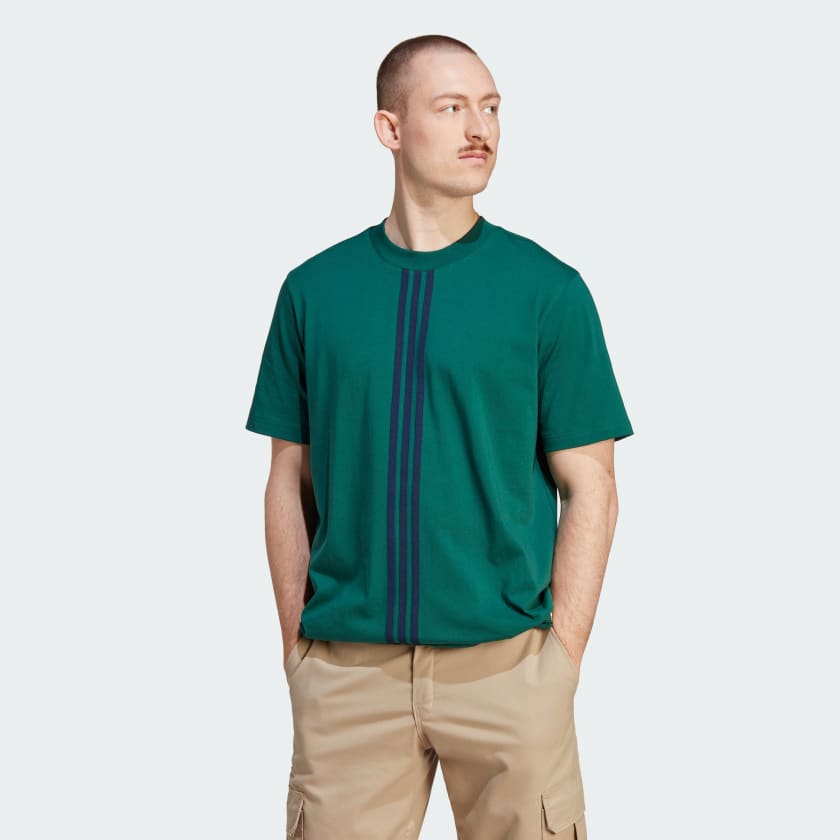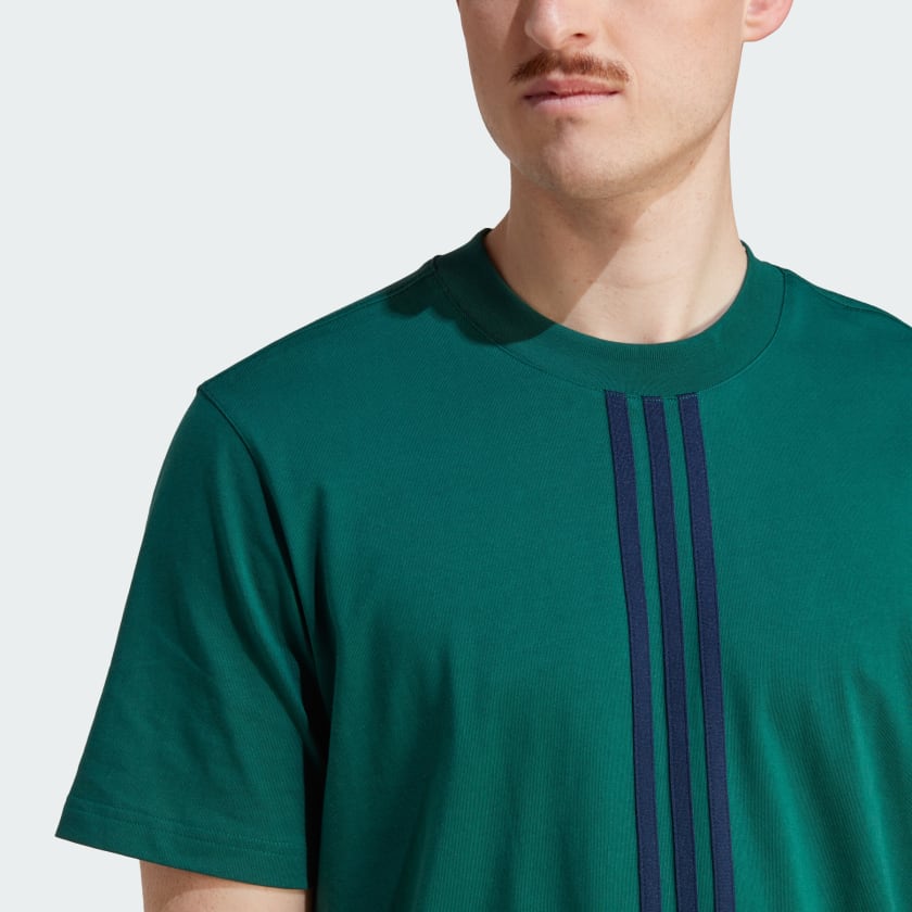 Double the DNA. This adidas t-shirt shows the 3-Stripes on the front and back, a change from their usual spot on each sleeve. Soft cotton single jersey has a slight stretch to keep you comfortable, and a ribbed crewneck stays fitted up top as you move through the day. Our cotton products support more sustainable cotton farming.