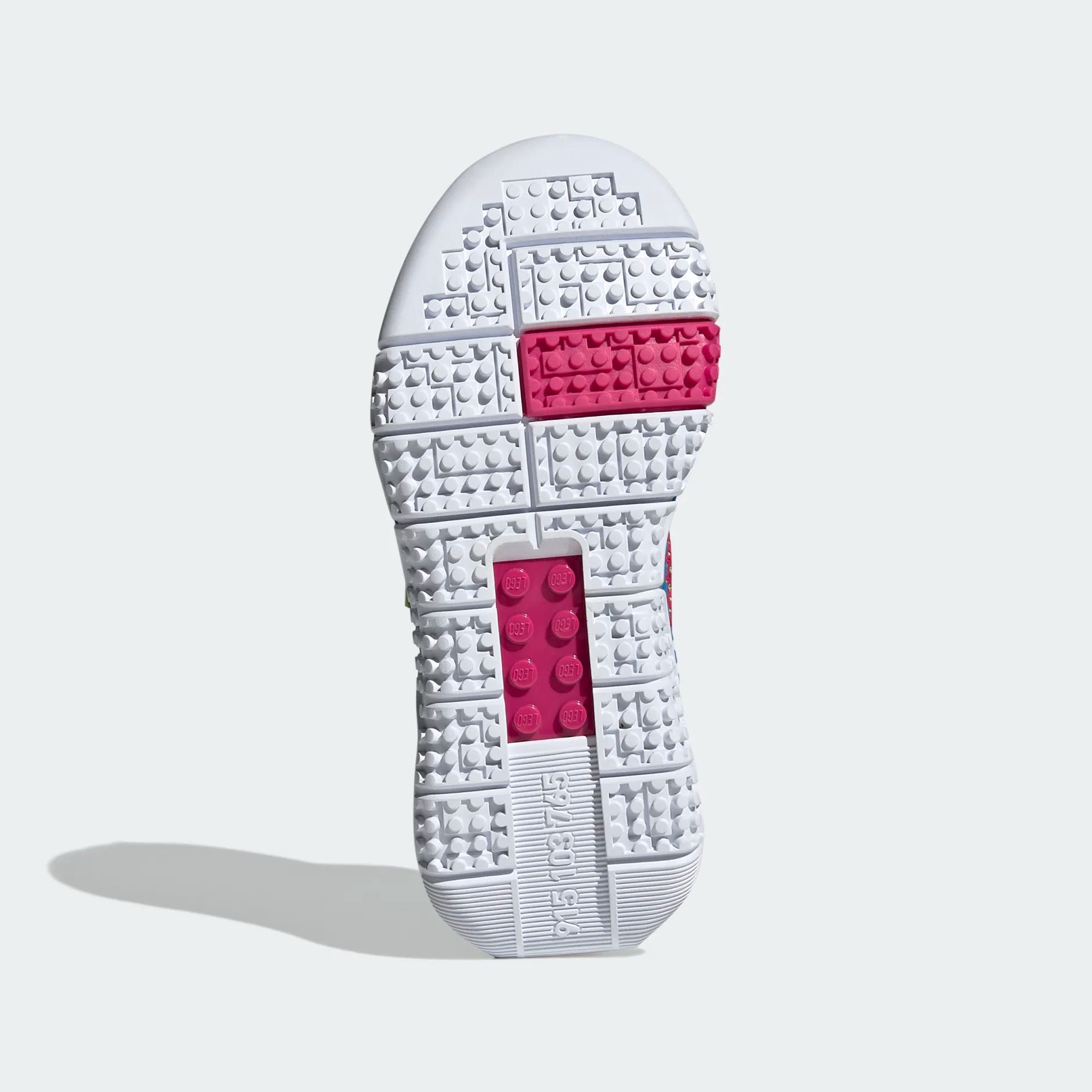 Let your little builder bring their LEGO® bricks with them wherever they go. Watch your kids smile with glee as they pull on these adidas running shoes. The elastic laces plus hook-and-loop strap create a snug, secure fit. The grippy outsole leaves a happy trail of LEGO® tracks behind them. Made with a series of recycled materials, this upper features at least 50% recycled content. This product represents just one of our solutions to help end plastic