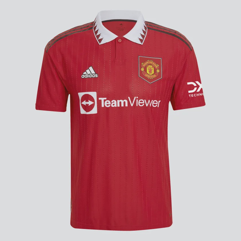 Turned up or pressed down, the humble polo collar has played a starring role in many of Manchester United's biggest moments. Making a comeback on this adidas home authentic jersey, it joins a shield-style badge and engineered pinstripe graphic to produce an eye-catching look. Cooling HEAT.RDY and lightweight details support football worthy of the Old Trafford turf. Made with 100% recycled materials, this product represents just one of our solutions to help end plastic waste.