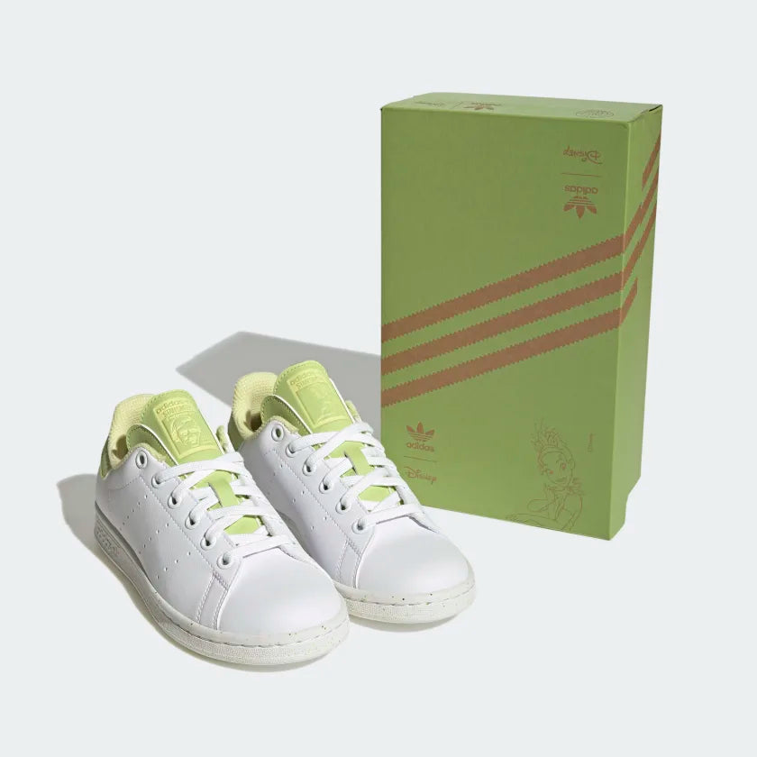 For over 50 years, the adidas Stan Smith sneaker has solidified its place as a style icon. Now this juniors' version gets a magical update with these shoes inspired by Tiana, the princess from Disney's "The Princess and the Frog." Make a statement with cool green details set on a synthetic leather upper and a printed sockliner that adds a fun detail to classic comfort. The heel patches are a reminder that "It's not easy being green," so it's important to do our best for the planet. A snug fit with an OrthoLite® sockliner ensures that comfort isn't sacrificed for style. Made with a series of recycled materials, this upper features at least 50% recycled content. This product represents just one of our solutions to help end plastic waste.
