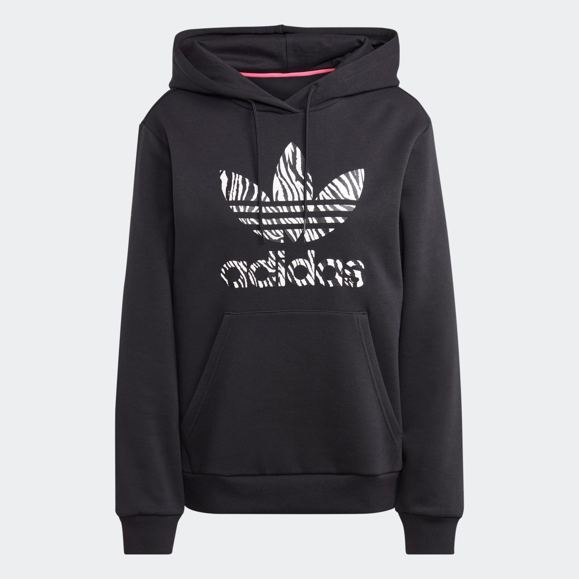 This adidas hoodie updates a classic look with a bold attitude. A centre Trefoil logo gets loud with a zebra print infill in colours that pop. A comfortable cotton blend fleece construction helps keep you comfortable whether you're heading out to meet up with friends or catching up on your favourite television show. A minimum of 70% of this product is a blend of recycled and renewable materials.