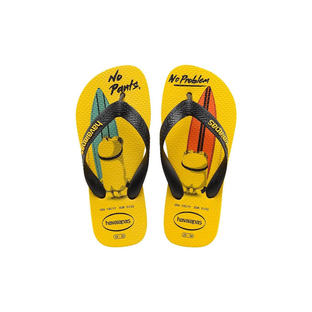The Minion edition of Brazil's original and authentic flip-flops. One of the funniest and most amusing models of Havaianas. This version comes in a yellow print showing two pantless Minions surfing with the message "no pants, no problem".