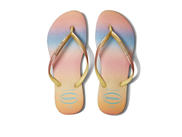 Havaianas Slim Gradient Sunset print flip-flops were inspired by the perfect sunset colors. The metallic finish encloses the whole sandal, including the side soles and the straps, taking this model to a whole new level of beauty and fashion.