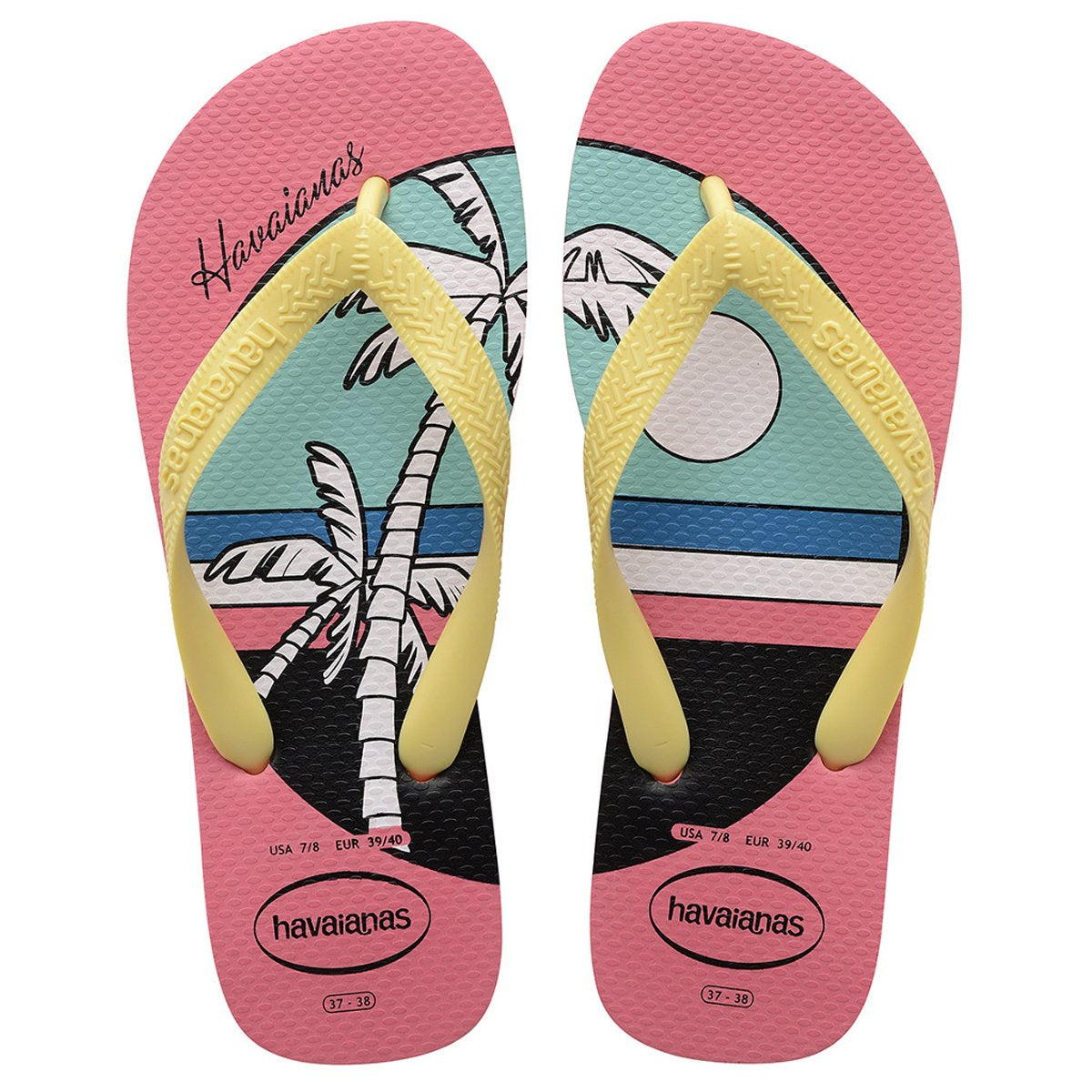 Summer all year long in the Top Vibes flip flop. An homage to our favorite season, this colorful style features a beach scene in a hand-drawn style. Contrast straps stamped with a tonal Havaianas logo complete this laid back look.