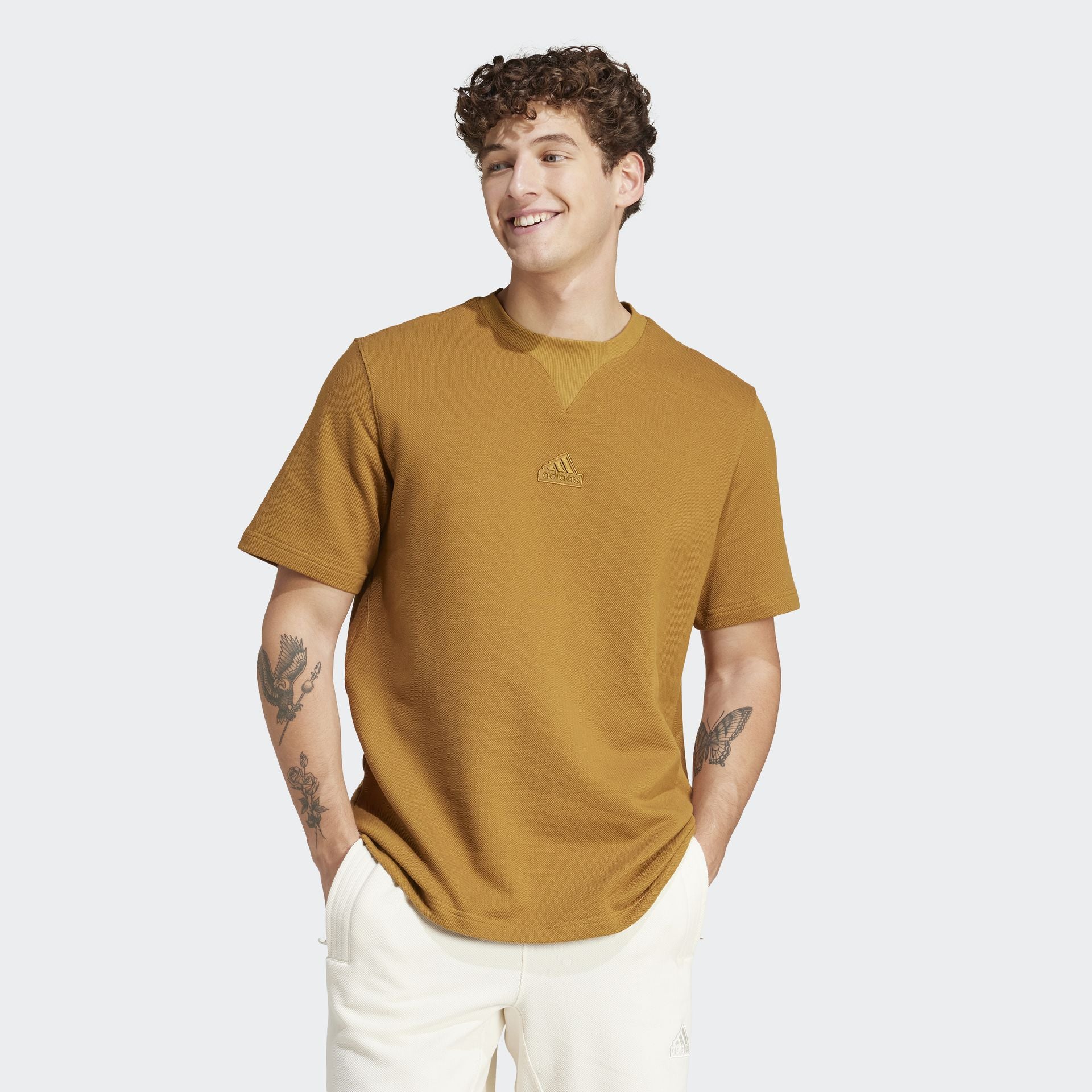 T-shirt cut, French terry feel. This loose, lounge-ready terry tee from adidas has your back whether you're heading out for coffee or cosying up on the couch. The cotton blend fabric keeps things casual yet stylish, allowing you to express your laid-back personality as you slip into relax mode.