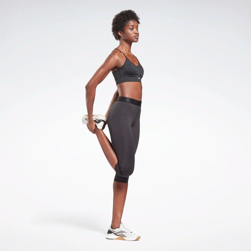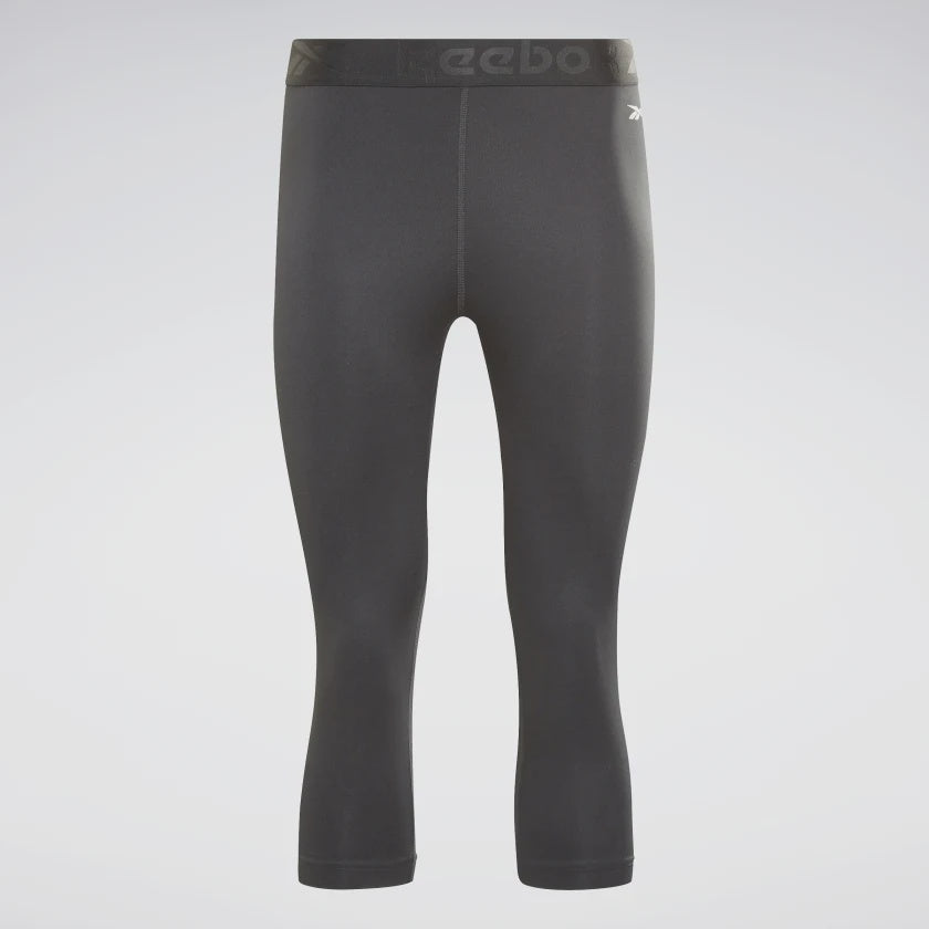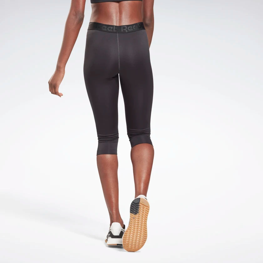 Leave your best effort on the floor. These women's tights are made of soft, moisture-wicking fabric that helps you stay dry and comfortable during your training sessions. The three-quarter-length tights have a wide waistband dressed up with a Reebok graphic.