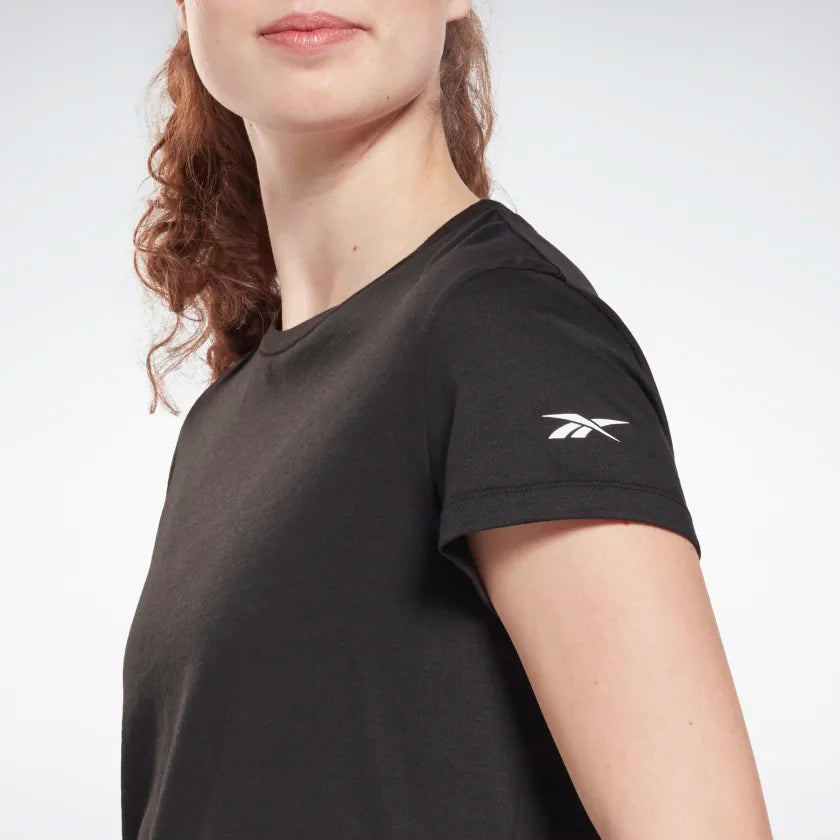 Show up for yourself. This women's t-shirt has an all-cotton build for comfort that lets you focus on the task at hand. The slim fit is for a streamlined feel when you're stretching and recovering. A Reebok Vector logo on the sleeve signals your commitment to sport. Our cotton products are entirely sourced through sustainable cotton farming and are made with at least 50% Better Cotton.