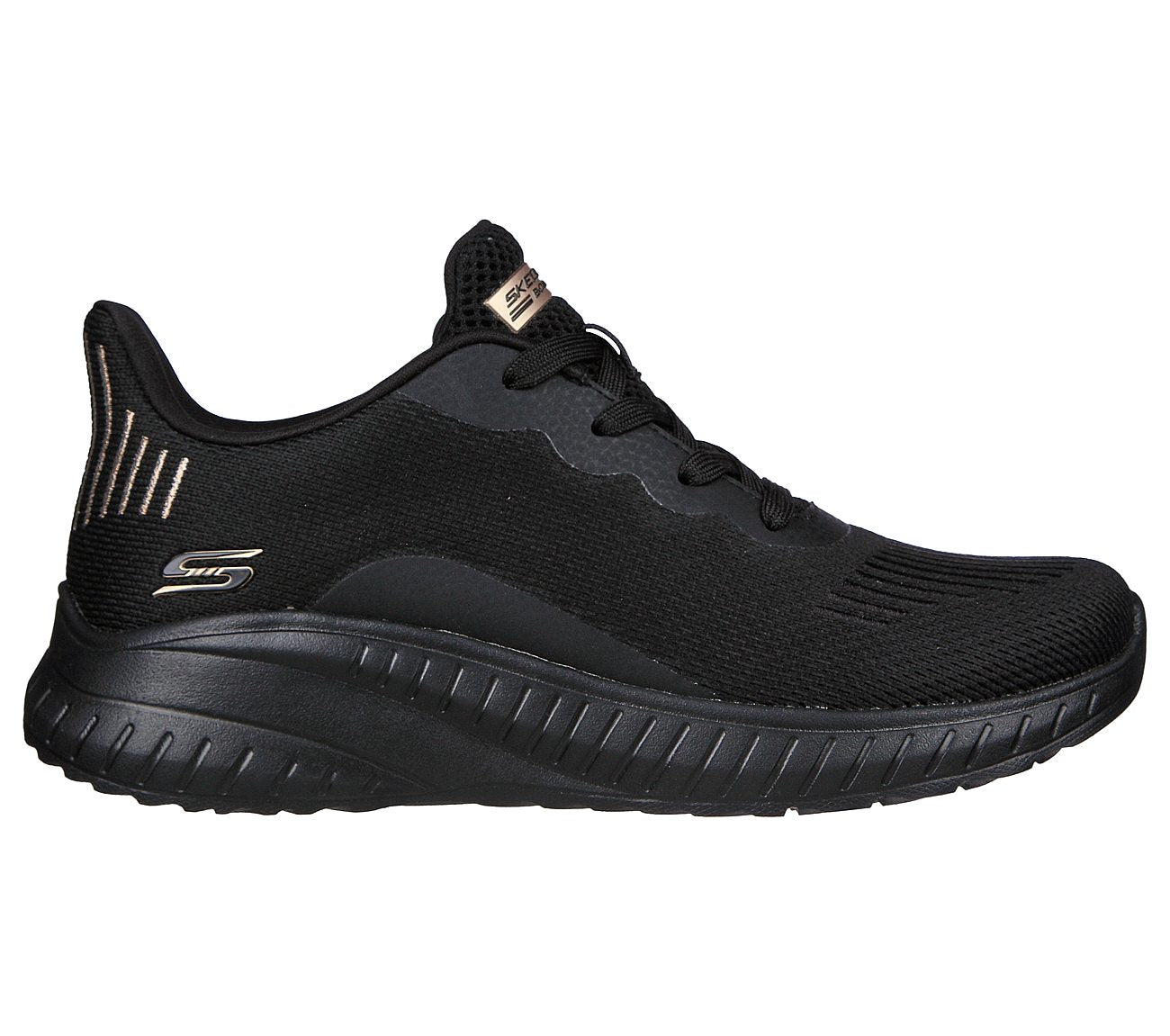 - Engineered mesh knit upper with lace-up front Contoured shock-absorbing midsole Flexible rubber traction outsole 1 1/4-inch heel BOBS from Skechers logo detail