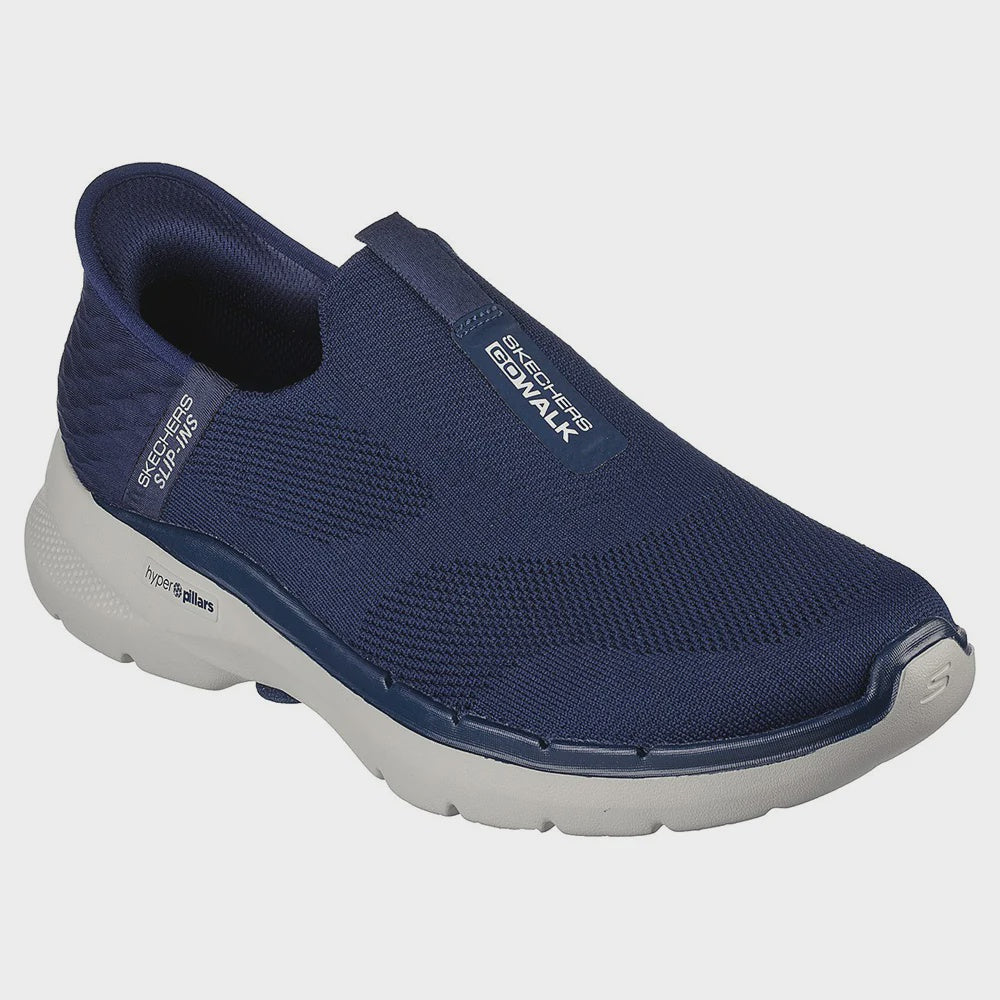 Go handsfree and step into supportive comfort wearing Skechers Slip-ins™: GO WALK® 6. This slip-on features an engineered knit and synthetic upper with a Skechers Slip-ins™ molded heel panel, a Skechers Air-Cooled Memory Foam® insole, lightweight ULTRA GO® cushioning midsole and high-rebound Hyper Pillar Technology™ for added support.