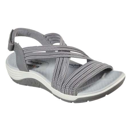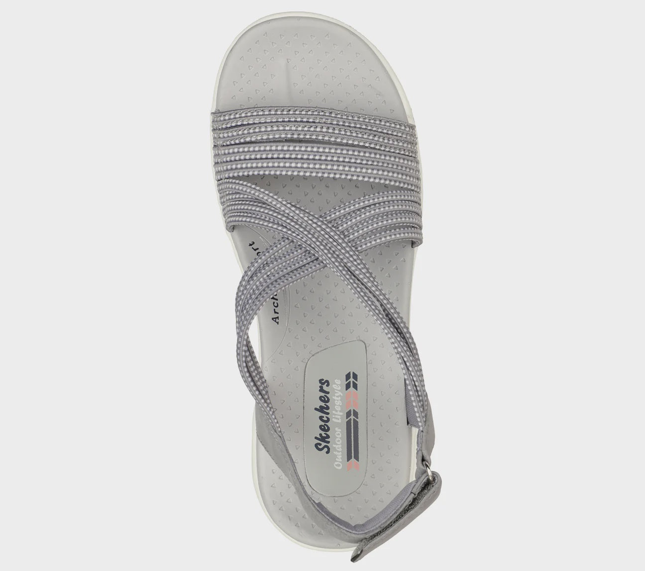 Add freedom of movement and comfortable style to your wardrobe with Skechers Reggae Cup - Independence. This casual back strap sandal features a stretchy fabric upper with an adjustable heel strap, an Arch Comfort cushioned footbed and a shock absorbing midsole for added support.