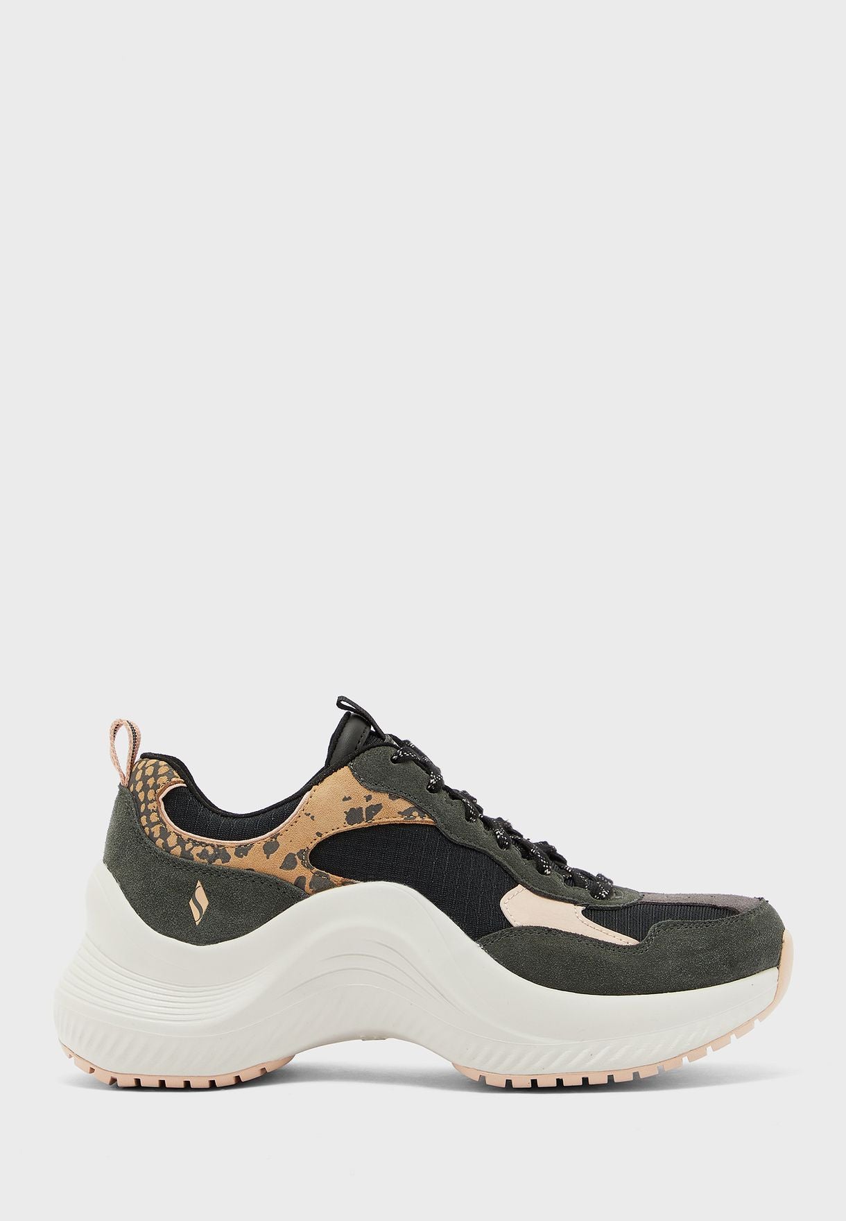 - Colour block smooth synthetic, mesh fabric and patterned fabric overlay detailing