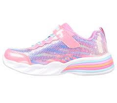 Cute heart-filled style and all-day comfort combine in Skechers Sweetheart Lights - Let's Shine. This casual lightweight slip-on features a sequin embellished fabric and glitter synthetic upper with a light-up midsole.